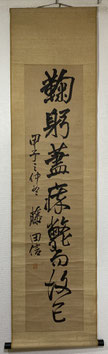 紙本半切、29×131㎝、一行、落款「甲子之仲冬藤田信」、三十三歳書(三十四歳没)、元治二年敦賀の来迎寺にて処刑される前年の書、印一、布装、焼け・弱皺有、史料価値大、箱。
