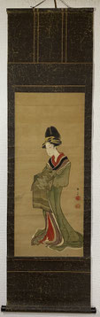 絹本尺33×78㎝、彩色美人図、落款「南喬」、印二「南喬」他四,紙製丸装、全体時代色有、「浮世絵総覧」・森屋治兵衛板に『源平武者梅之魁』南喬画、同『勇力月弓張』南喬画とあり、詳細不明。