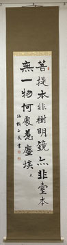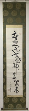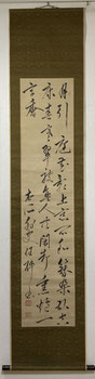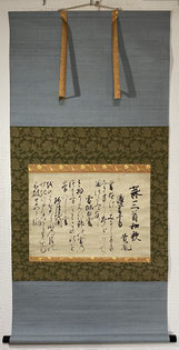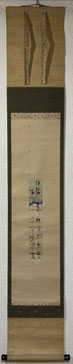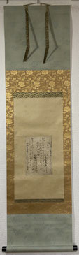 紙本半切、32×128㎝、二行、印三照合、緞子丸装、箱。岡山。