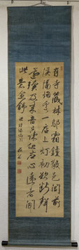 絹本尺一、34×110㎝、五律詩四行「有寺蔵林鄔霜鐘散邑閭・・・」、印三照合、落款「疎鐘隔塢聞」、緞子丸装、時代色少有、書品特上、菘翁晩年中風様書、箱「菘翁書」。