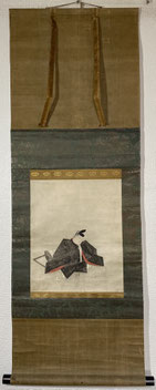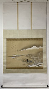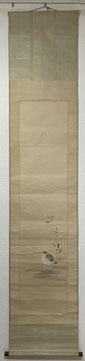 紙本半切、28×122㎝、彩色鶉図、印一、絹製三段装、状態時代なり、箱。