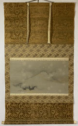 絹本横物、56×31㎝、水墨添彩富士図、「法眼交山機真宰写於無分別室縄床」、印一、緞子三段装、状態並やや下、珍品、箱。【松本交山】1784~1866年。江戸後期の画家・俳人。江戸深川八幡境内の茶屋松本の主人。店を弟に譲り画を谷文晁に俳諧を酒井抱一に学んだ。法眼。