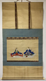 絹本横物、52×35㎝、彩色細密画雛図、落款「江北翁楽央六十六歳画」、印一、緞子三段装、状態並、珍品、史料価値、箱。江戸中期。狩野玉燕季信・狩野永叔主信門。黒川亀玉の師。享保頃の人。