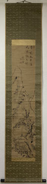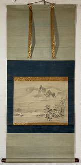 紙本半切、25×117㎝、水墨山水画賛、印三照合、緞子装、焼皺少有、箱。