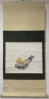 紙本横物、46×38㎝、淡彩静物画、緞子三段装、皺少有、共箱。