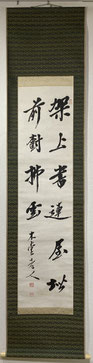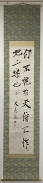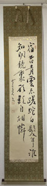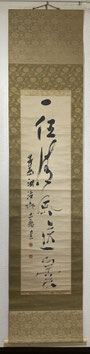 紙本半切、32×132㎝、二行、印三、緞子丸装、箱無。日下部鳴鶴門。